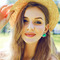 Young happy smiling girl sitting outdoor in wooden floor, smiling and having fun alone on her vacation in stylish bright summer clothes.