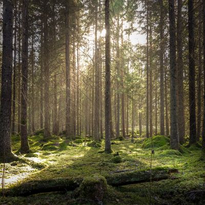 Coniferous forest, ground covered of green moss. Backlit trees. Mystic atmosphere.