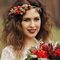 Young beautiful Bride holding a bouquet of purple pink. Red hair