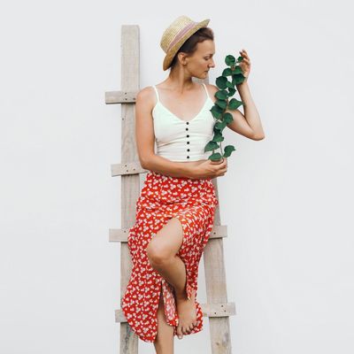 Young woman stands on a wooden bridge with raised arms up on the nature background. Travel, Freedom, Lifestyle concept. Slovenia, Europe.