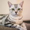 Half body cat portrait in studio. American shorthair cat opening his mouth.