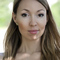 portrait of a beautiful Asian woman with red lips and roses in her hair isolated on black studio background