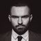 Fashionable European business man in perfect suite walk on the street, using skateboard longboard and sute man