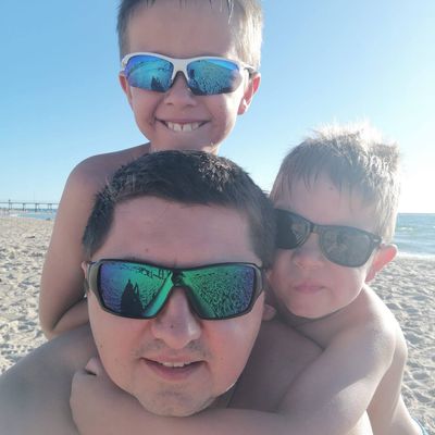 Happy aussie boy riding his bicycle on bike lane on a day in Glenelg, South Australia