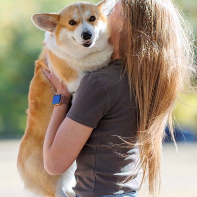 Beautiful woman playing with her ??dog. Outdoor portrait. series
