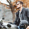 young beard man posing in the street, fashion style, vintage glasses, sunglasses, mustache
