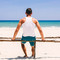 sexy bikini girl swim sea waves hands up jump splash in tropics on vacation back view