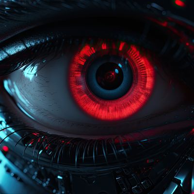 Young and attractive woman from future with the laser hologram on her eyes (collage about eye scanning technology)