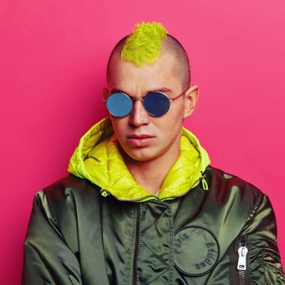 Portrait of attentive hipster guy with pink hair and tattoo on arm dressed in casual basic t shirt looks directly at camera has serious expression isolated over white background belong to subculture